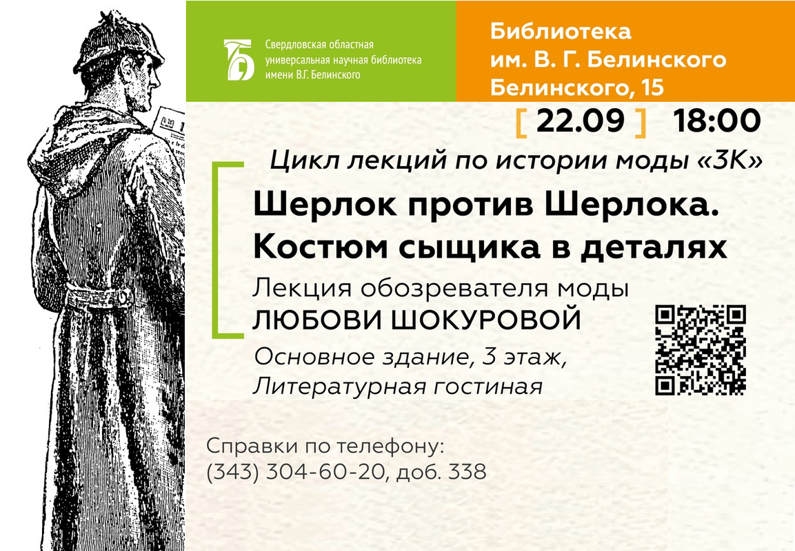 ХОДИЛ ЛИ ШЕРЛОК ХОЛМС В КАЛОШАХ? Об этом вы сможете расспросить на лекции в Екатеринбурге 22 сентября в Библиотеке имени Белинского. В рамках своего цикла по истории моды Любовь Шокурова расскажет о том, как одевался сыщик с Бейкер-стрит. Лекция "Шерлок против Шерлока. Костюм сыщика в деталях" состоится 22 сентября, в 18.00 - в Литературной гостиной на 3 этаже основного здания Свердловской областной универсальной научной библиотеки имени Белинского. ----------------- Постараюсь быть и запечатлеть событие в памяти.